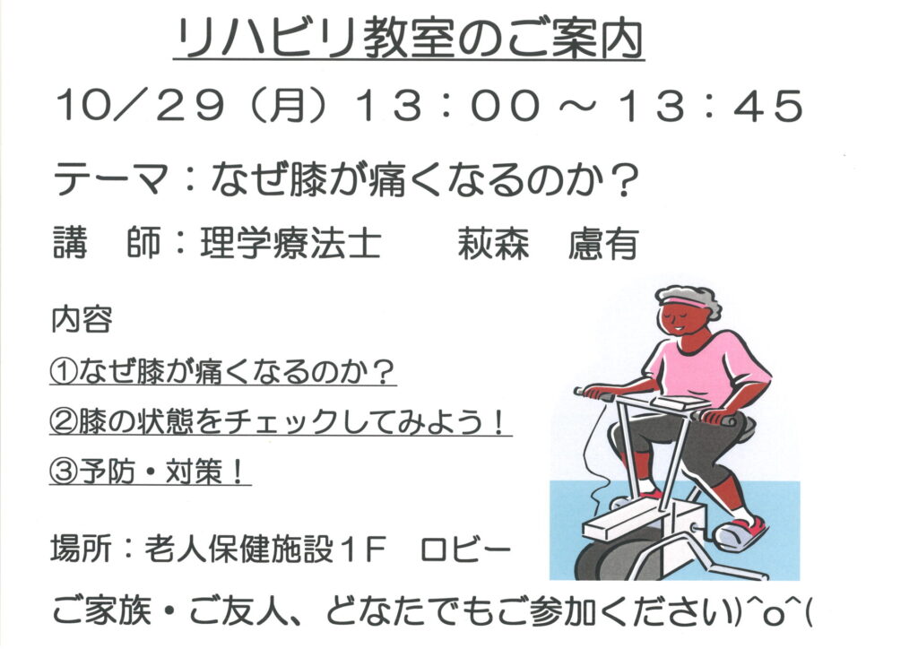 お知らせ TOP お知らせ 10月 リハビリ教室開催のお知らせ 2025.10.14 10月 リハビリ教室開催のお知らせ お知らせ 10月のリハビリ教室のご案内です。 膝の痛み、放っておかずに“原因”から知ってみませんか? ご家族・ご友人とお気軽にお越しくださいませ。 介護老人保健施設ヒロセ通所リハビリ介護老人保健施設ヒロセ ショートステイ介護老人保健施設ヒロセ 前のページへ 一覧へもどる 次のページへ