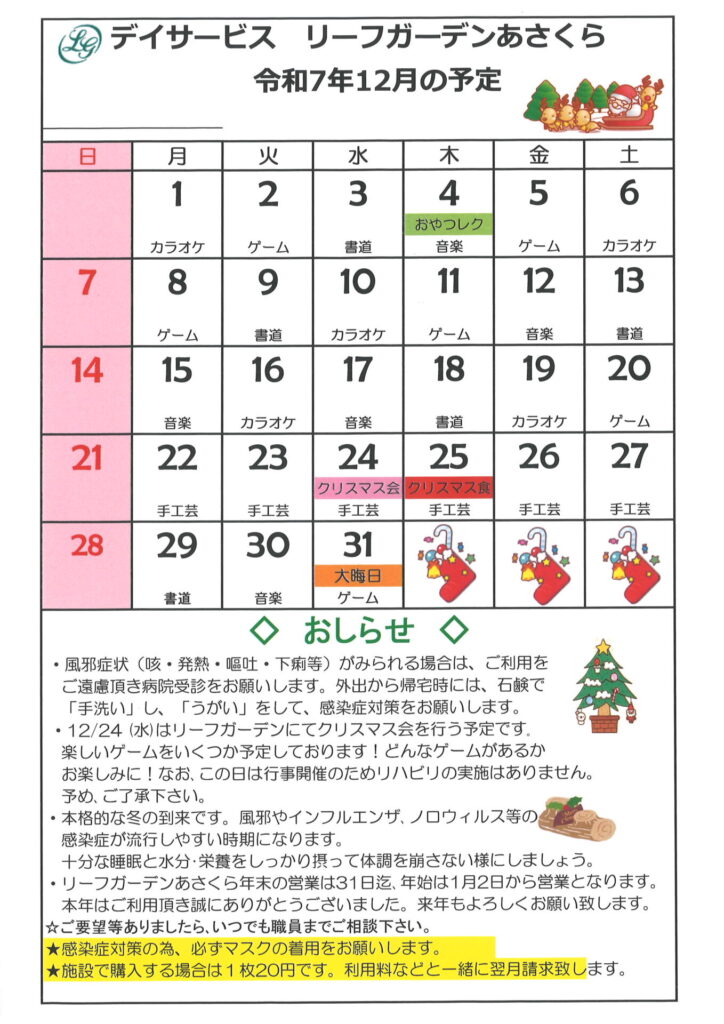 お知らせ TOP お知らせ デイサービスリーフガーデンあさくら 行事予定を掲載しました 2025.12.03 デイサービスリーフガーデンあさくら 行事予定を掲載しました お知らせ 令和7年も残り1ヵ月をきりました。今月はクリスマス会を予定しております。体調にご留意されてご利用ください。 デイサービス リーフガーデンあさくら 前のページへ 一覧へもどる 次のページへ