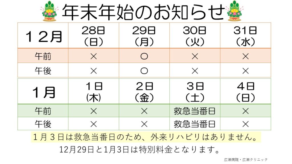 お知らせ TOP お知らせ 年末年始のお知らせ 2025.12.11 年末年始のお知らせ お知らせ 年末年始の診療時間です。ご不明な点がございましたら、お問い合わせください。 一覧へもどる 次のページへ