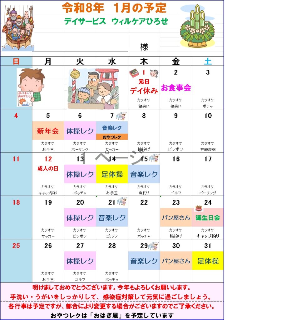 お知らせ TOP お知らせ デイサービス ウィルケアひろせ 行事予定を掲載しました。 2026.01.03 デイサービス ウィルケアひろせ 行事予定を掲載しました。 お知らせ 新年あけましておめでとうございます。昨年中は、当施設の運営にご理解とご協力を賜り、誠にありがとうございました。本年も、ご利用者様お一人おひとりが安心して穏やかにお過ごしいただけるよう、職員一同、心を込めてまいります。 本年も、ご利用者様お一人おひとりが安心して穏やかにお過ごしいただけるよう、職員一同、心を込めてまいります。 前のページへ 一覧へもどる 次のページへ