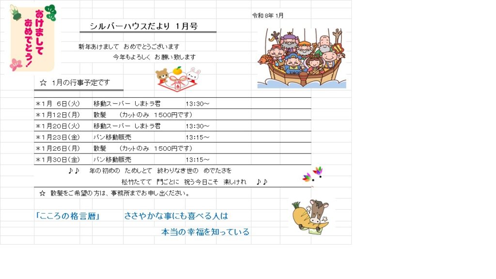 お知らせ TOP お知らせ シルバーハウス ウィルケアひろせ 行事予定を掲載しました。 2026.01.03 シルバーハウス ウィルケアひろせ 行事予定を掲載しました。 お知らせ あけましておめでとうございます。 本年もご入居者様の立場に寄り添い、安心・安全で温かみのある介護サービスを努めてまいります。皆様にとりまして、本年が健やかな一年となりますよう、心よりお祈り申し上げます。 本年もどうぞよろしくお願い申し上げます。 シルバーハウスウィルケアひろせ 前のページへ 一覧へもどる 次のページへ
