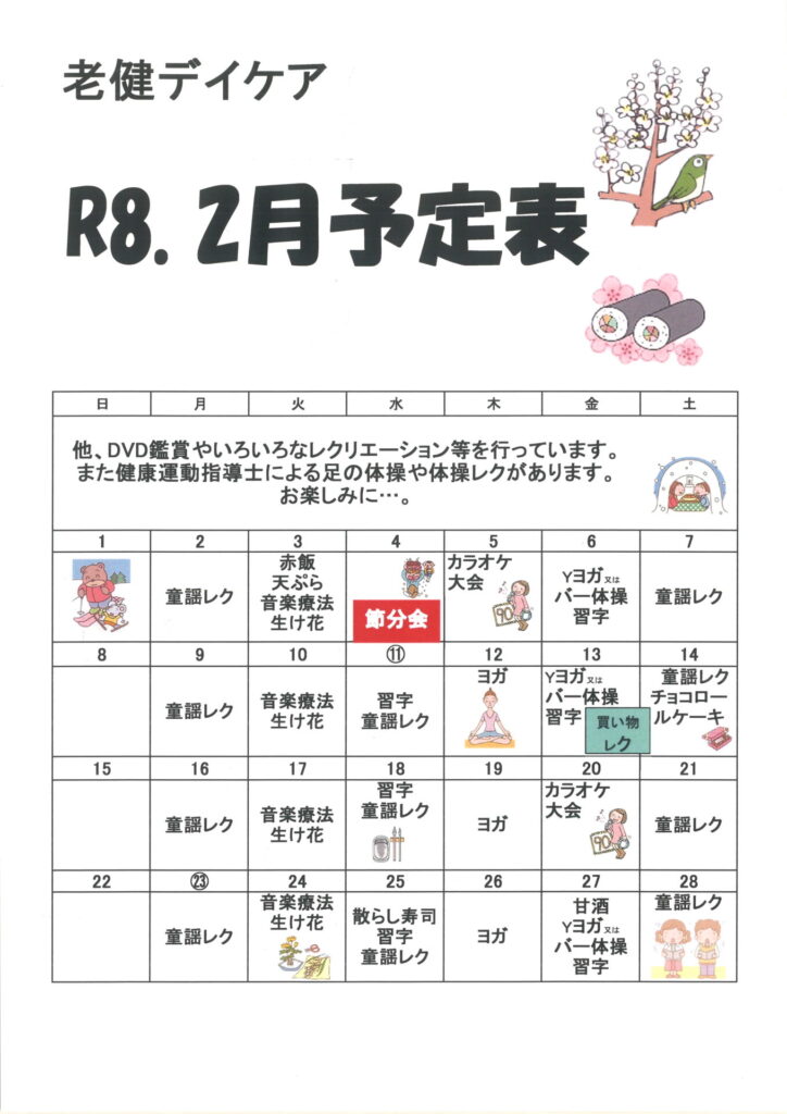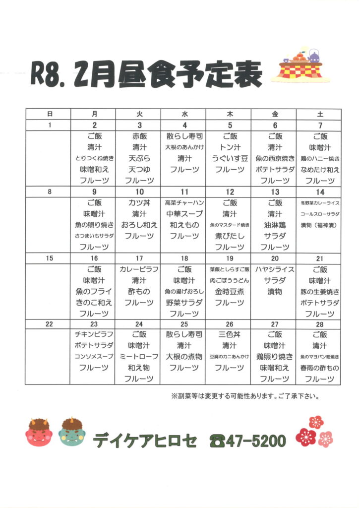 お知らせ TOP お知らせ 介護老人保健施設ヒロセ デイケア 2月行事予定・献立表 掲載しました 2026.02.01 介護老人保健施設ヒロセ デイケア 2月行事予定・献立表 掲載しました お知らせ 介護老人保健施設ヒロセ 通所リハビリテーション(デイケア)の2月活動内容とお食事の献立を公開しております。 利用をご検討中の方はいつでもご連絡ください。 介護老人保健施設ヒロセ通所リハビリ介護老人保健施設ヒロセ ショートステイ介護老人保健施設ヒロセ 一覧へもどる 次のページへ