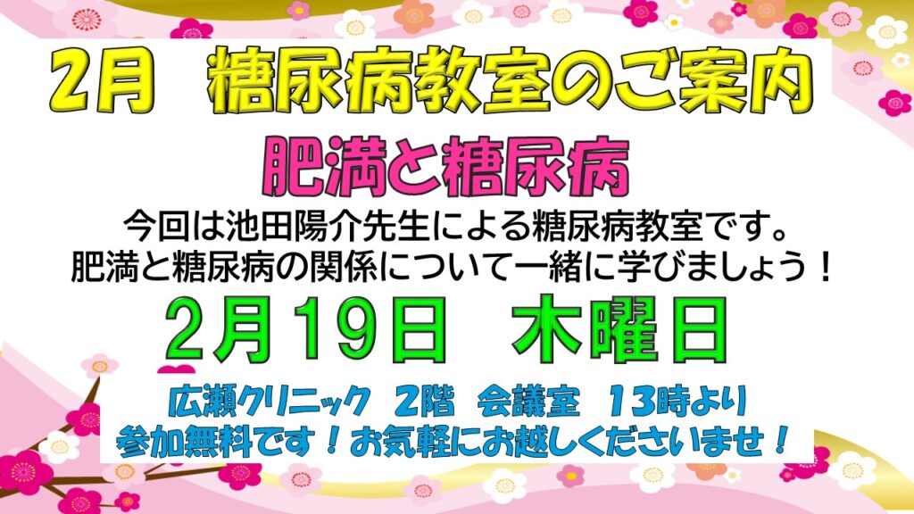 お知らせ TOP お知らせ 2月19日の糖尿病教室のご案内 2026.02.10 2月19日の糖尿病教室のご案内 お知らせ 今月は池田陽介医師による教室です。先生に質問などお聞きすることもできますので、お気軽にお越しください 一覧へもどる 次のページへ