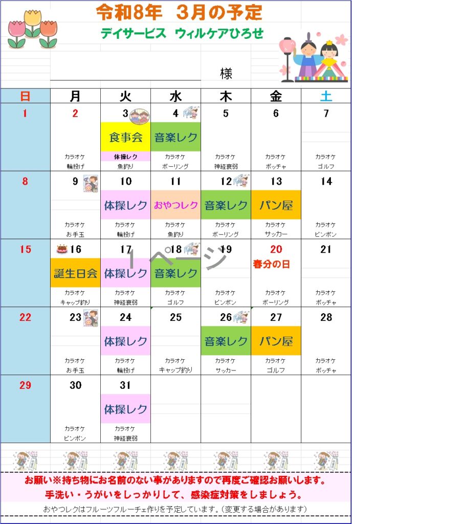 お知らせ TOP お知らせ デイサービスウィルケアひろせ行事予定掲載しました。 2026.02.28 デイサービスウィルケアひろせ行事予定掲載しました。 お知らせ 少しずつ春の気配を感じられる季節。お食事会など、彩り豊かな行事を企画しています。 前のページへ 一覧へもどる 次のページへ