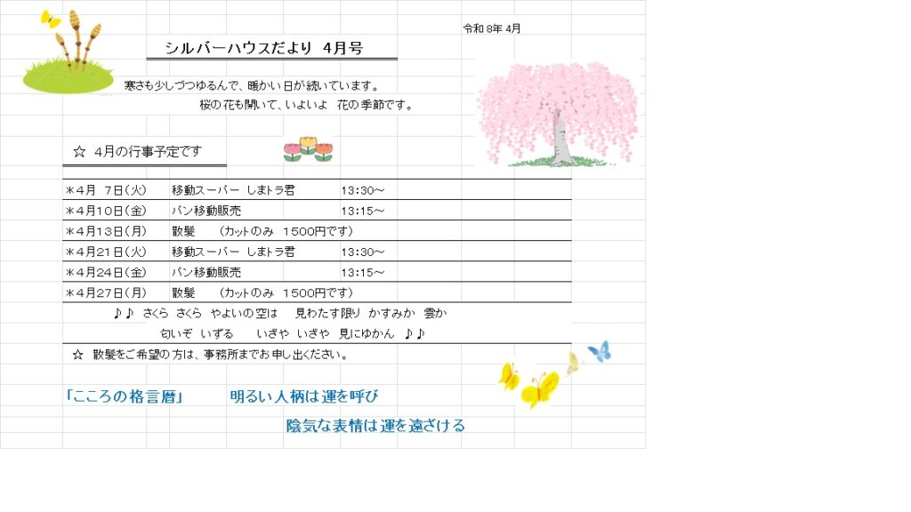 お知らせ TOP お知らせ シルバーハウスウィルケアひろせ 行事予定掲載しました。 2026.04.01 シルバーハウスウィルケアひろせ 行事予定掲載しました。 お知らせ ぽかぽかとした春の季節となりました。 今月も散髪や移動スーパーなどを予定しており、日々を楽しくお過ごしいただければと思います。 シルバーハウスウィルケアひろせ 前のページへ 一覧へもどる 次のページへ