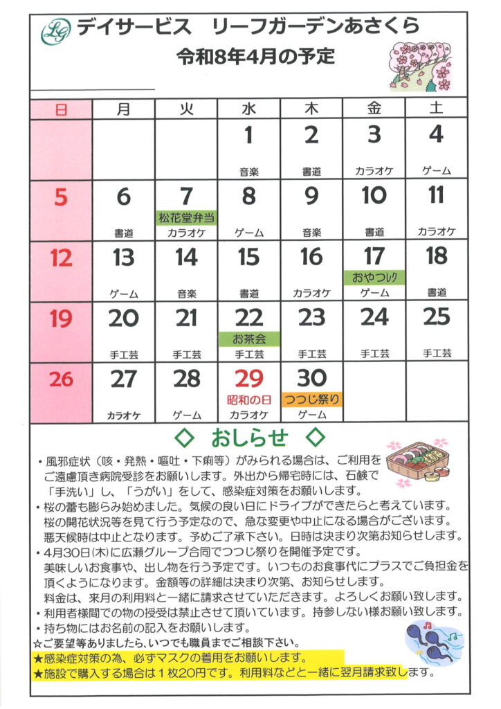お知らせ TOP お知らせ デイサービスリーフガーデンあさくら 行事予定を掲載しました 2026.04.01 デイサービスリーフガーデンあさくら 行事予定を掲載しました お知らせ 桜🌸が見ごろの季節になりました。施設内の桜もきれいに咲いています 4月の行事予定をお知らせいたします デイサービス リーフガーデンあさくら 前のページへ 一覧へもどる 次のページへ