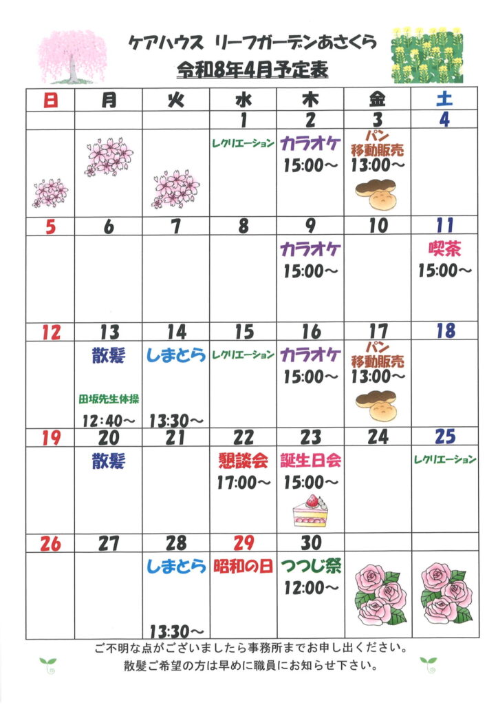 お知らせ TOP お知らせ ケアハウスリーフガーデンあさくら 行事予定を掲載しました 2026.04.01 ケアハウスリーフガーデンあさくら 行事予定を掲載しました お知らせ 食堂や居室の窓から見える桜🌸は、今が満開です 4月の行事予定をお知らせします ケアハウスリーフガーデンあさくら 前のページへ 一覧へもどる 次のページへ